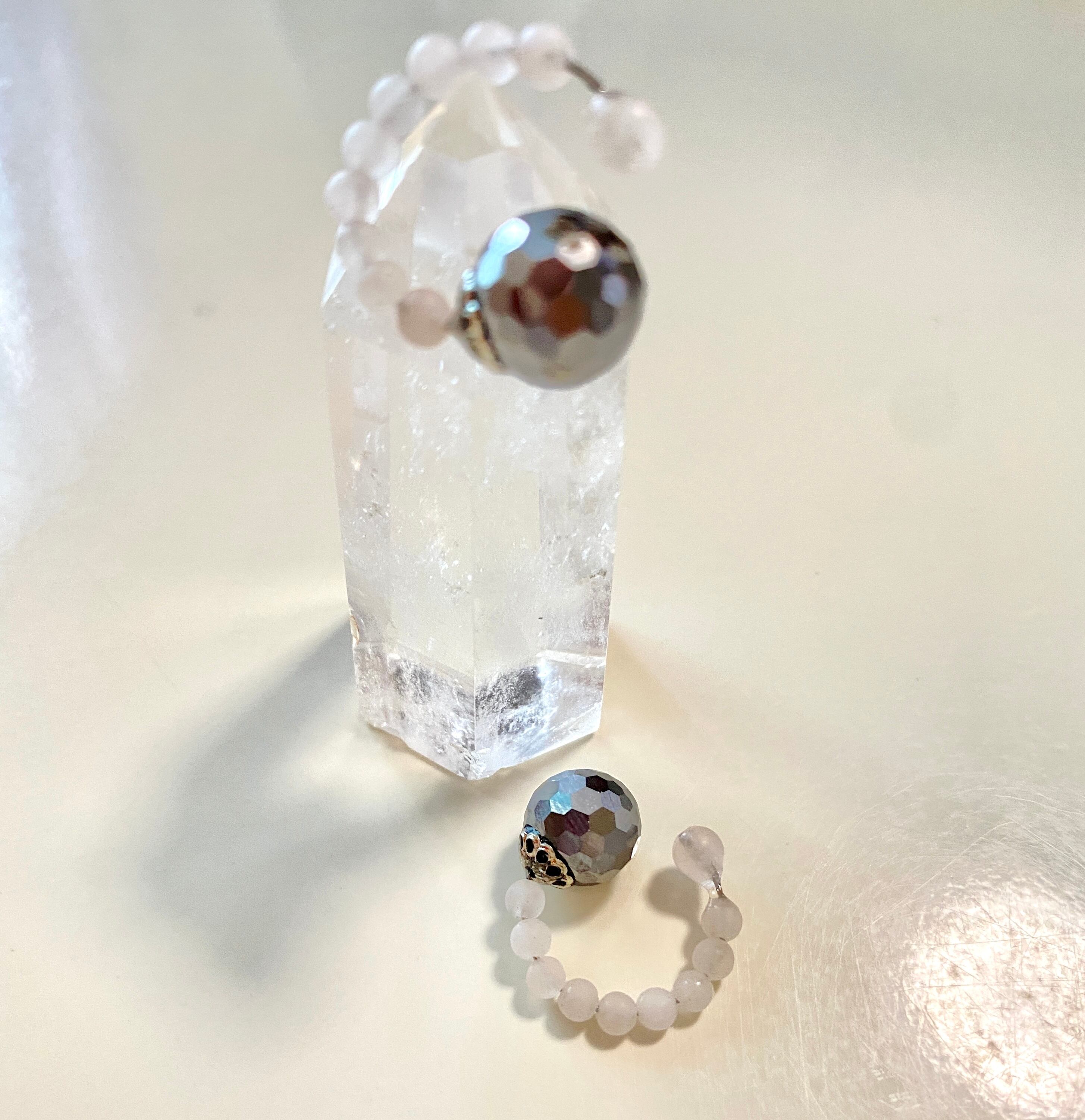 後玉にテラヘルツ鉱石をあしらい、ローズクォーツで全体を飾った洗練されたカフ。