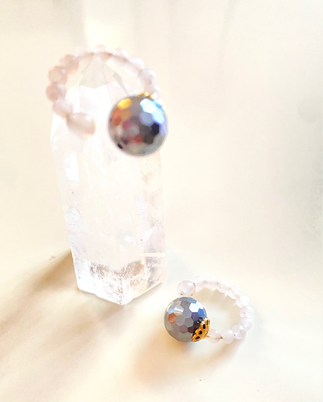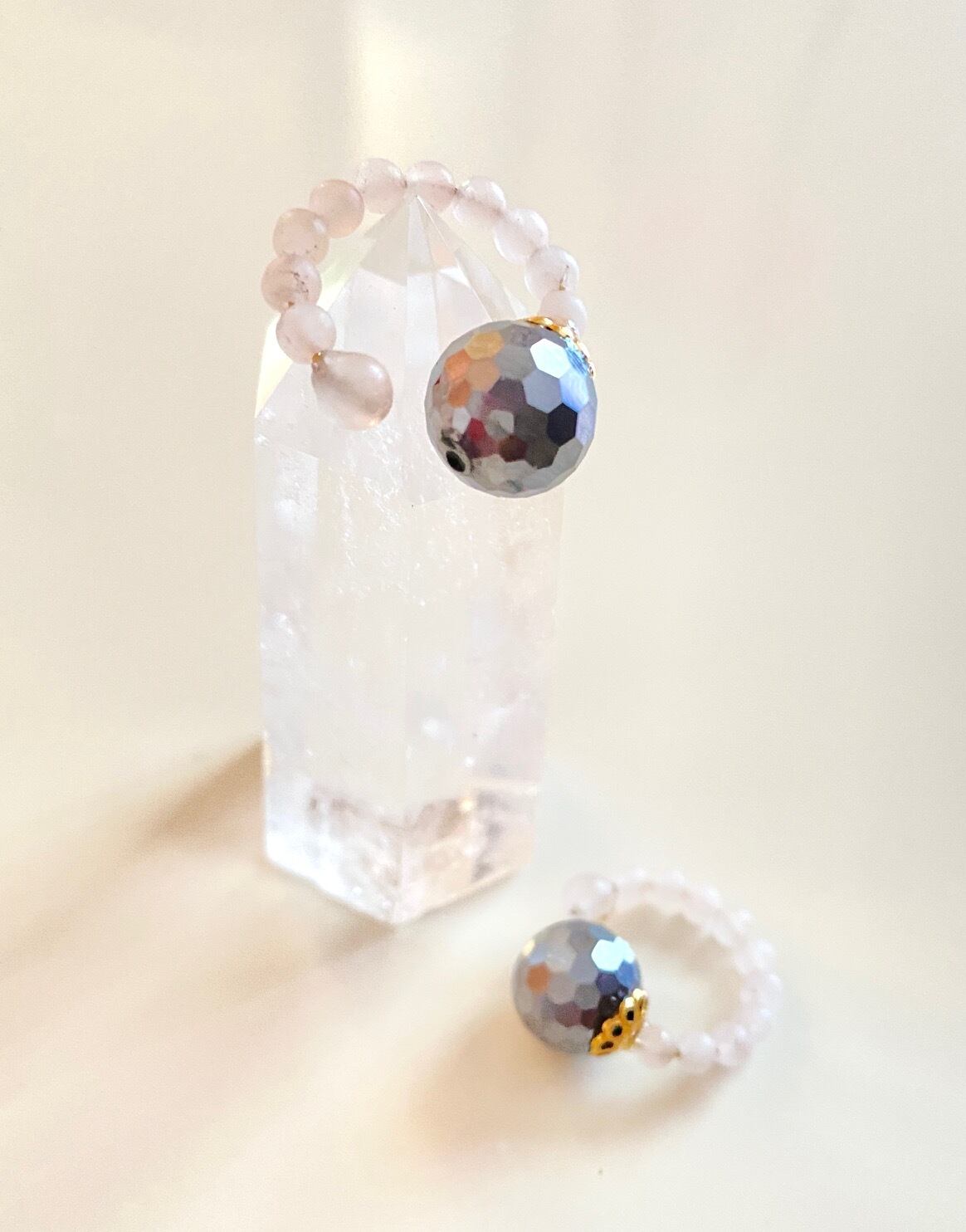 後玉にテラヘルツ鉱石をあしらい、ローズクォーツで全体を飾った洗練されたカフ。