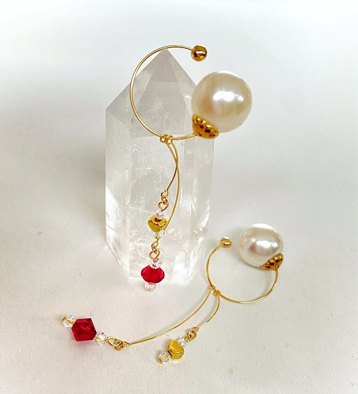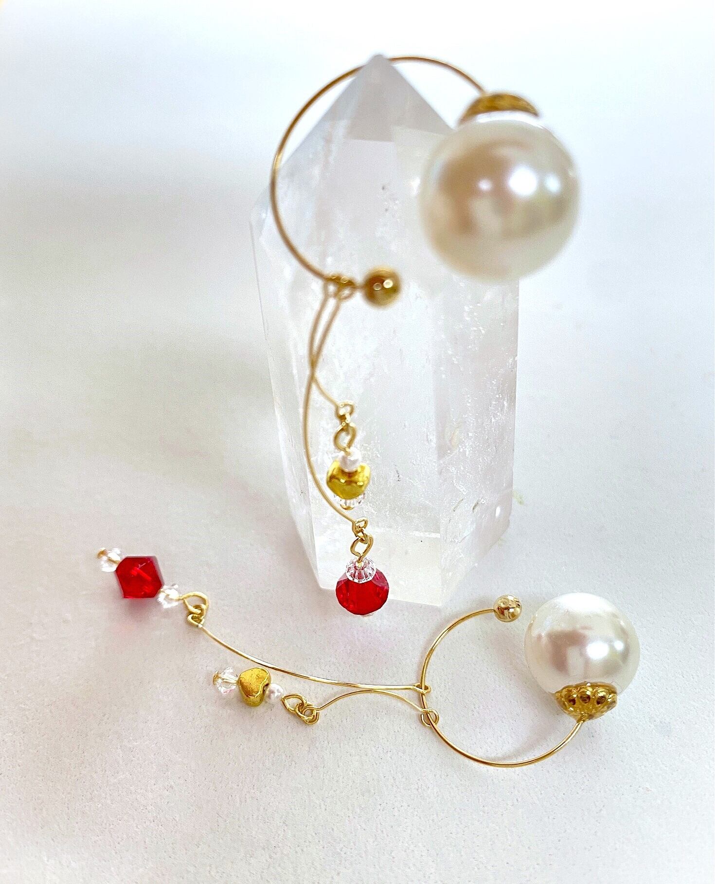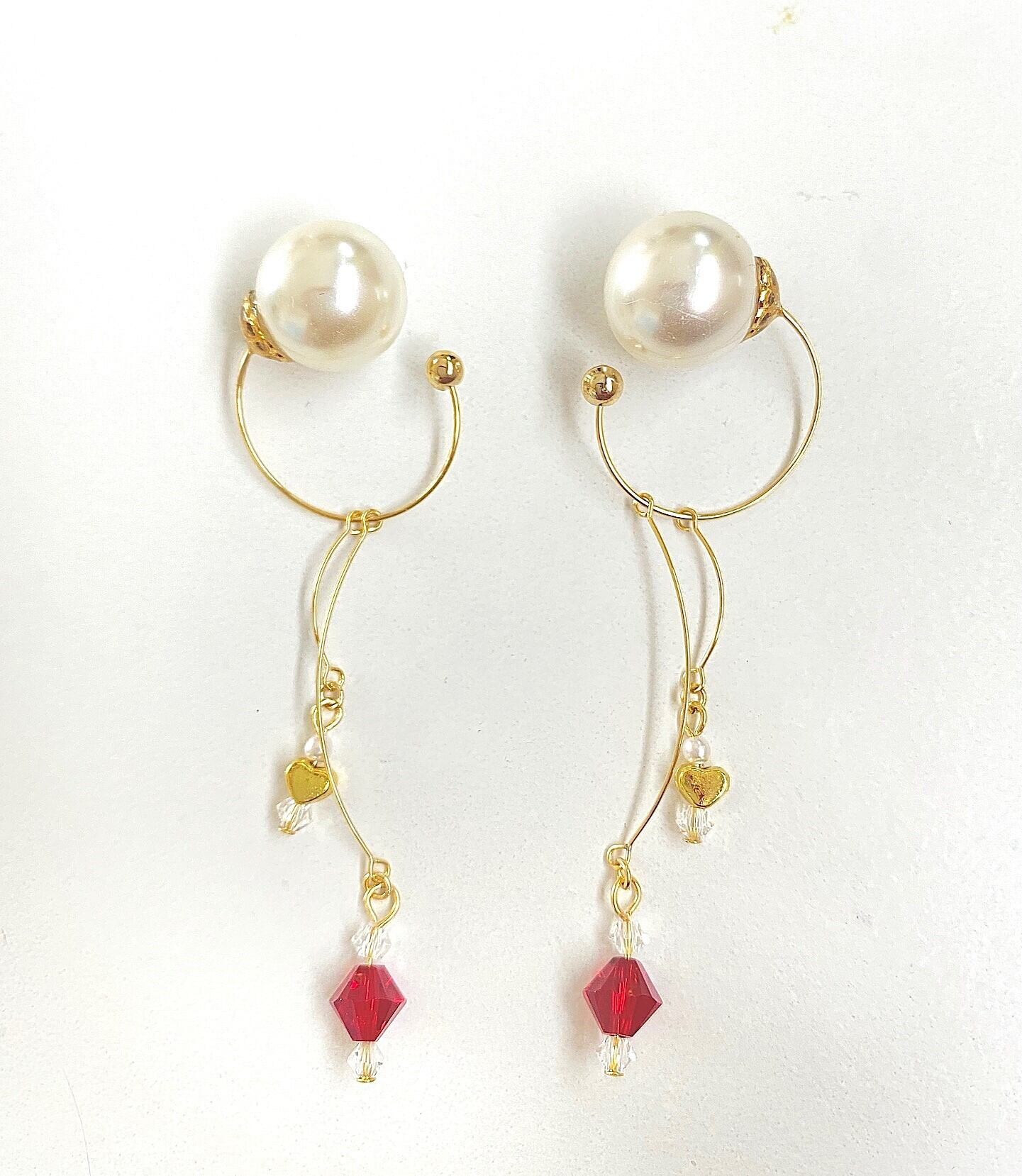 赤いダブルコーンのスワロフスキークリスタルと、小さなゴールドのメタルハートが、ジョイントワイヤーで軽やかに揺れるイヤーカフ。