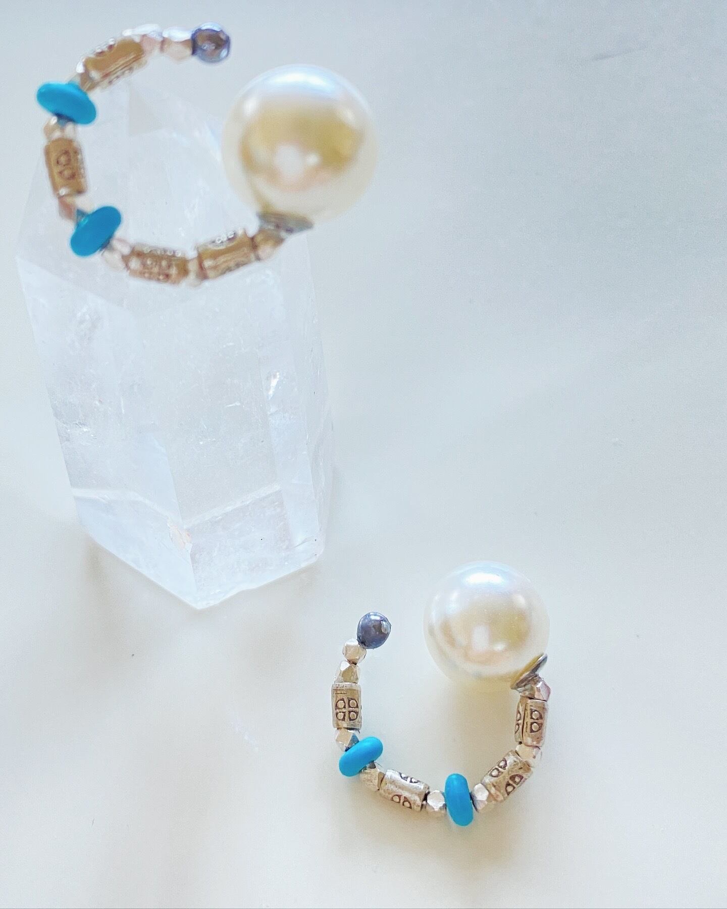 土台となるワイヤーは真鍮ですが、肌に接触する部分は、シルバー、トルコ石、テラヘルツ石、プラスティック・パールとなります。金属アレルギーは、人により反応する素材が違いますので、100%アレルギーに対応するとは限りませんので、素材を確認のうえ、ご了承ください。
