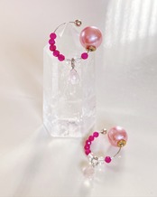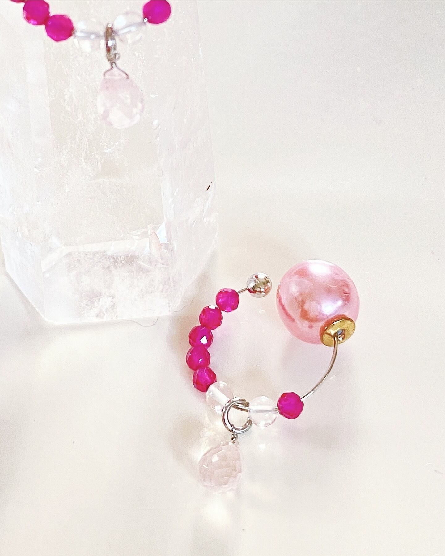 目を引くビビットなマジェンタのビーズは、上質な研磨とエッジ部分がシャープに仕上がった、鑑別された合成ルビーです。ドロップは天然石ローズクォーツ、それに合わせてピンクの玉でコーディネートしました。